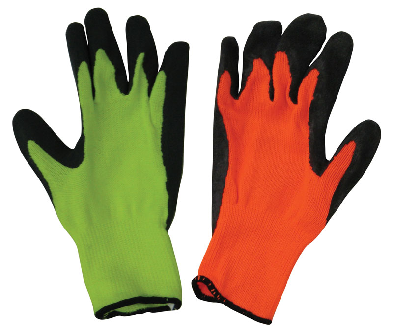 Knit glove with coated palm. High visibility cotton / polyester with knit liner and coated black latex palm.